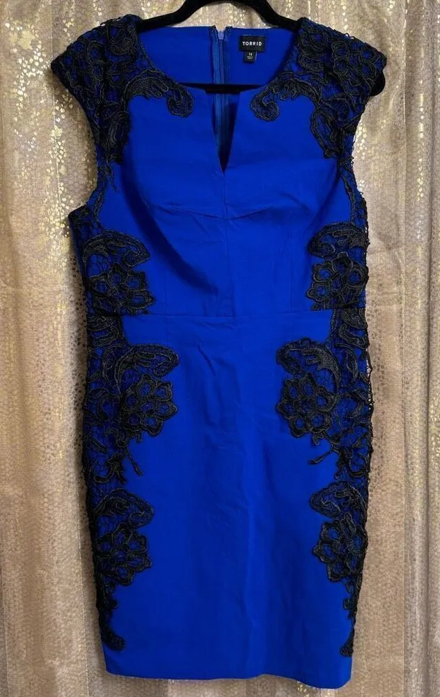 Torrid Royal Blue Black Embroidered Lace Bodycon Mini Sheath Dress Size 14 Good very gently used co... Show more