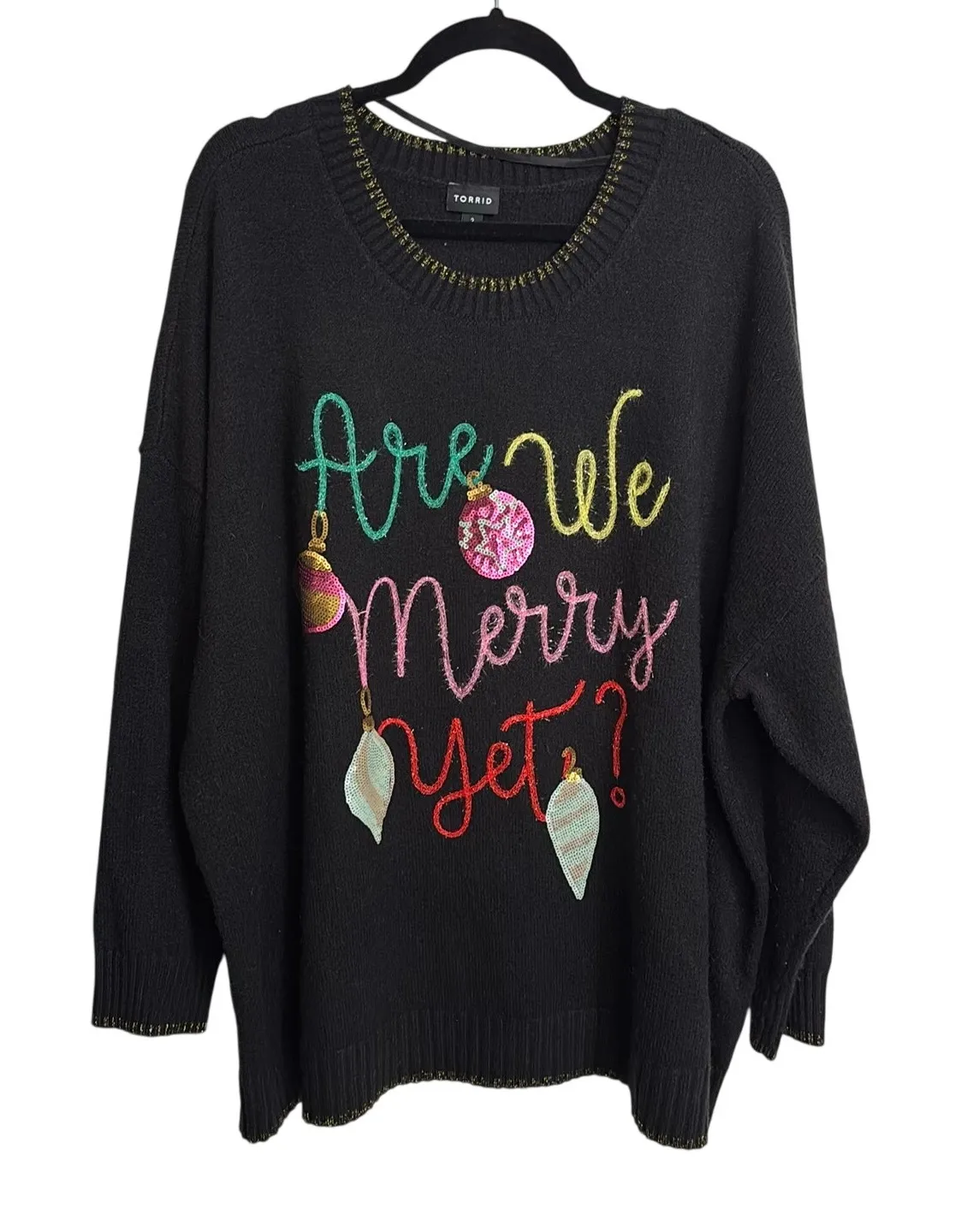 Torrid "Are We Merry Yet?" Holiday Sweater in Black with gold lurex knit trim accents. Features a fe... Show more