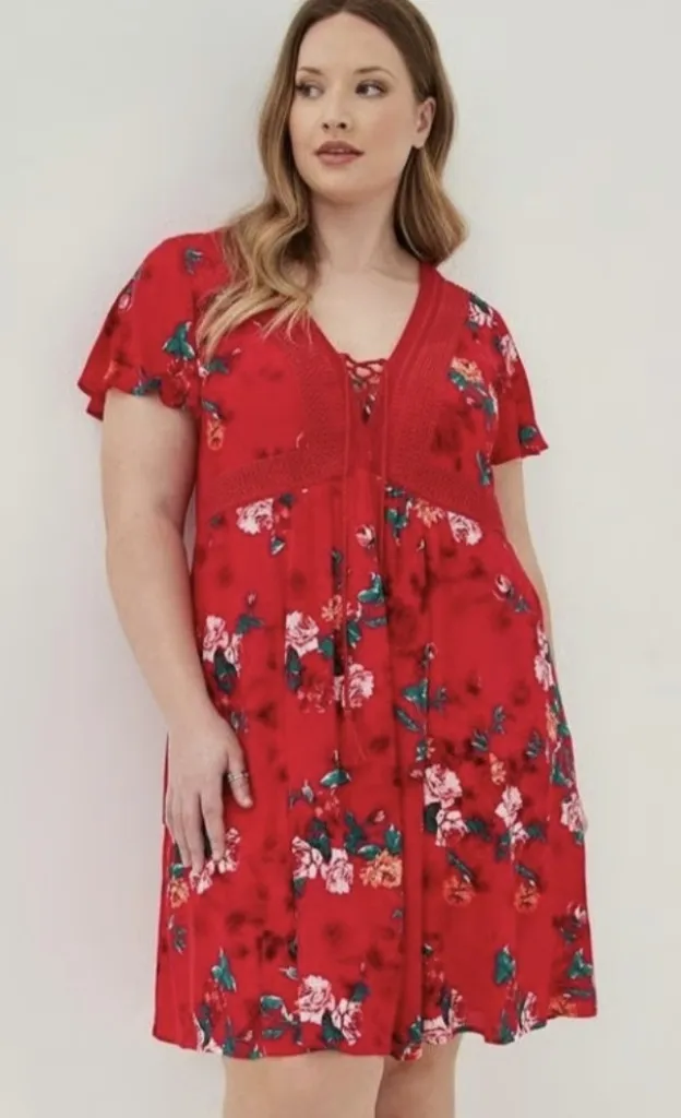 Chic red dress featuring a vibrant floral pattern and lace detailing. Perfect for any occasion.