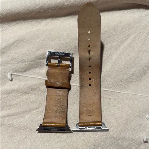 Stylish brown leather watch band with silver buckle. Perfect for any occasion.