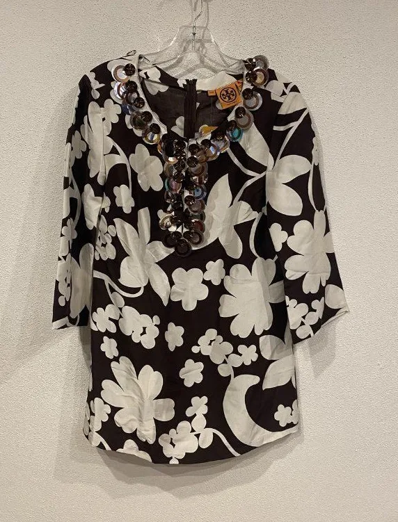Brand: Tory Burch Style: Womens 3/4 sleeve silk tunic blouse with relaxed fit and round neckline emb... Show more
