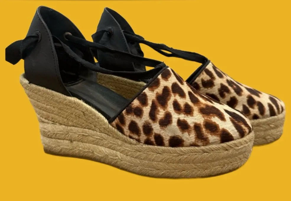 Stylish espadrille wedges with a bold leopard pattern. Features black ankle ties and a comfortable p... Show more