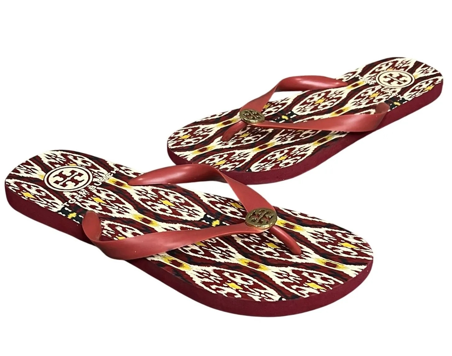 Tory Burch Flip Flops Womens Size 9 Burgundy Red Ikat Print Logo Casual Comfort Good pre owned cond... Show more