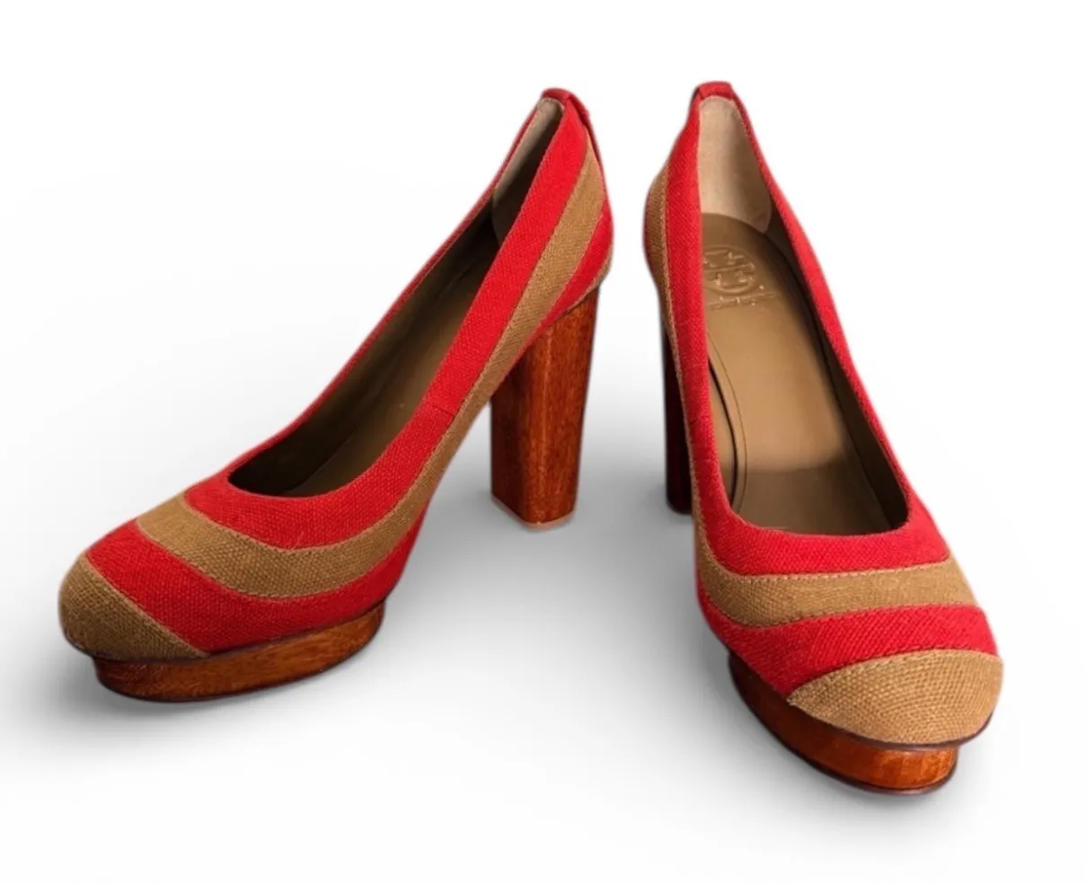 Elevate your style with these striking Tory Burch platform heels, a vibrant fusion of classic design... Show more