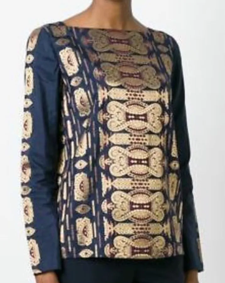 Condition: New with Tags (NWT) A stunning and luxurious long-sleeve top from Tory Burch. This eye-catching piece features a gorgeous metallic gold and deep burgundy/red brocade (jacquard) pattern on a navy blue background.