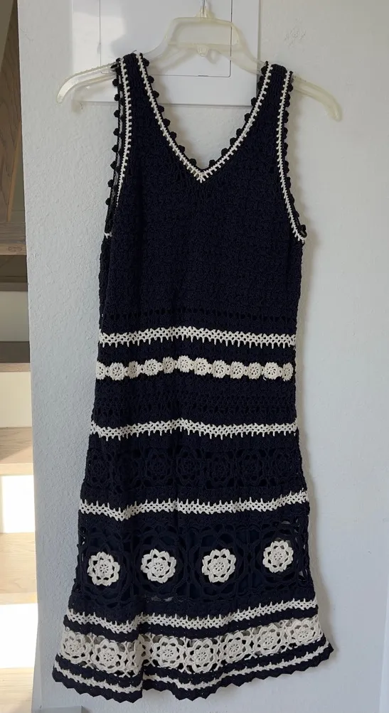 TORY BURCH Navy Blue White Cotton Sleeveless Crochet Floral Women's Mini Dress Excellent condition... Show more