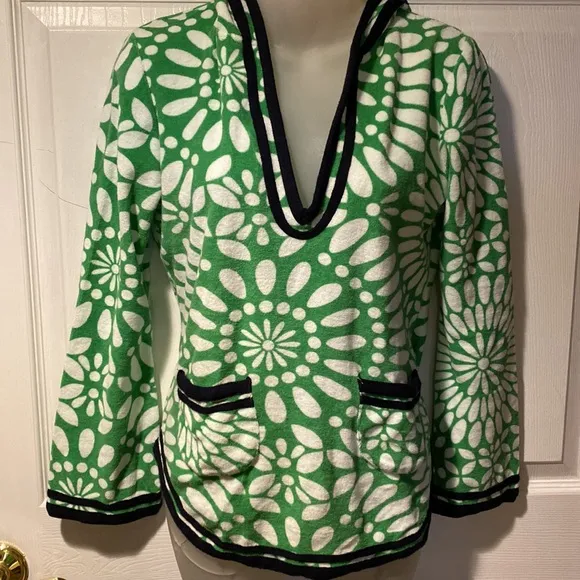 Green and white 100% cotton Terry cloth hoodie with navy trim throughout from Tory Burch. Size small... Show more