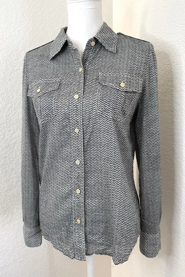 Beautiful lightweight airy blouse with black and cream chevron print with two button front pockets a... Show more