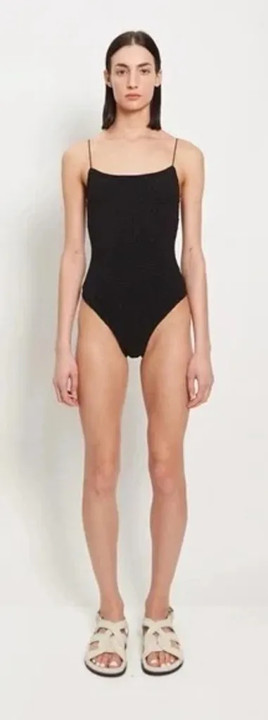 Toteme solid, spaghetti strap, square neck, one piece smocked swimsuit in color, ‘Black’. Sun-protec... Show more