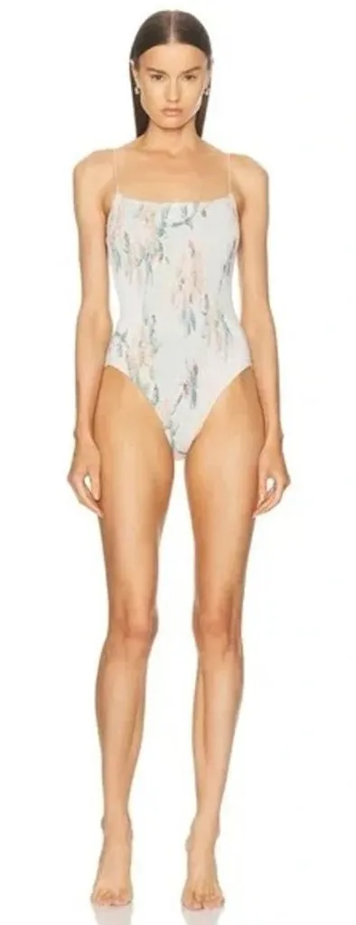Toteme cream/off white, printed, spaghetti strap, square neck, one piece smocked swimsuit in color, ‘Washed Floral’. Sun-protective, technical stretch jersey fabric construction in an allover shirred, smocked design & floral print. Thin elasticized spaghetti straps. Square neckline & low scoop back. Fitted silhouette. Pull-on styling. Size XL. Preowned - light marks at neckline. Front: 80% polyamide-recycled, 20% elastane Bust: 29.5” Length: 29” --- K5289