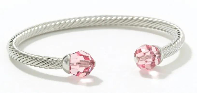 New in the box Touchstone Crystal by Swarovski With a Twist Bracelet, Light Rose Light Rose crystal; rhodium plating; 2½" adjustable diameter. Slightly squeeze or expand to adjust. Retail: $79