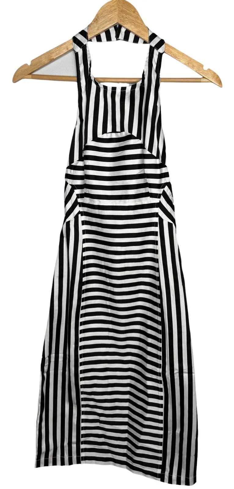 All orders shipped next business day. TOV Holy Inc Striped Halter Neck Backless Midi Dress Black White Women Size 8 38 A black and white striped halter neck midi dress. This sleeveless dress features a flattering halter neckline that buttons at the back of the neck and a chic open back design. The horizontal and vertical stripe pattern creates a visually interesting and slimming effect. Condition: Excellent Style: Sundress, Tank Dress Dress Length: Midi Department: Women Size: 38, US 8, Length- 40", Waist- 15.5" (31") Sleeve Length: Sleeveless Pattern: Striped Material: Cotton, Spandex Neckline: Halter Keywords: halter dress, backless dress, midi dress, striped dress, summer dress, casual dress, evening dress, women's fashion, aline dress, boho dress, chic dress, resort wear