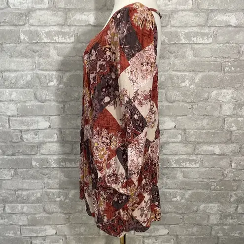 lightweight knit fabric patchwork print square neckline with crochet detail 3/4 balloon sleeves elas... Show more