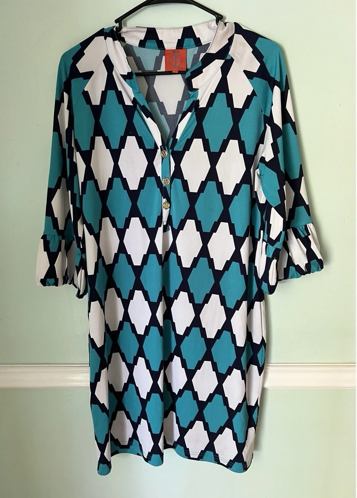 Tracy Negoshian Blue and White 3/4 Sleeve Midi Dress Size XL Catalina Stretch - $16 - From NiCole