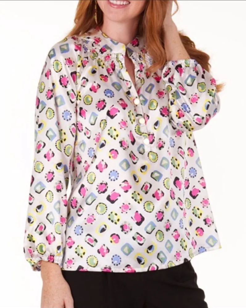 Tracy Negoshian Kira jewels print top. This effortless, smocked neckline Top could be worn in a professional setting or dressed down for a more casual setting. I love offers and bundles!