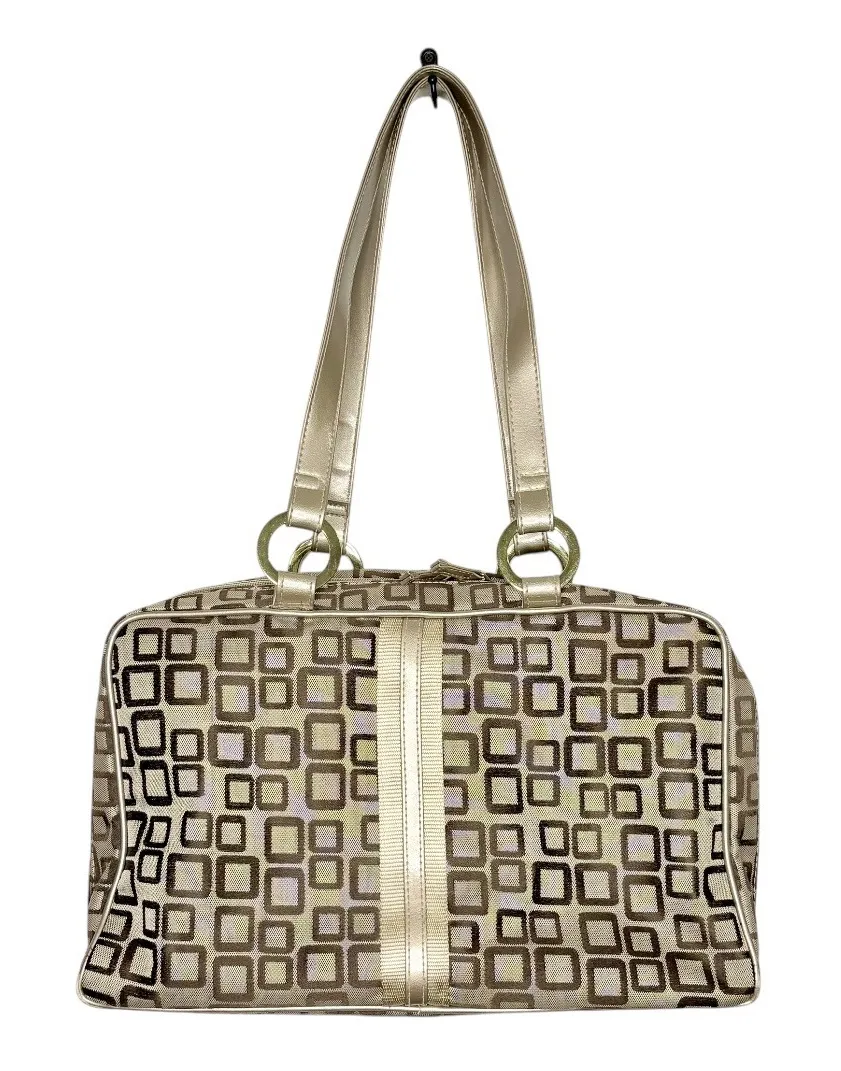 All orders shipped next business day. Travel Bag Geometric Tote Bag with Cosmetic Bag and Clear Pouch Like New 17x11 Stylish travel tote bag featuring a geometric square pattern in neutral tones. This chic bag includes gold-tone hardware accents, comfortable shoulder straps, and a spacious interior to carry all your essentials. It also comes with a matching cosmetic bag and a clear pouch, ideal for organizing smaller items. Pattern: Geometric Squares Size: 17"x11" Style: Tote Accents: Zipper Features: Removable Pouch, Lightweight, Pockets, Organizer Keywords: tote bag, geometric pattern, shoulder bag, cosmetic bag, clear pouch, beige tote, brown tote, everyday bag, work bag, travel bag, neutral tote, stylish tote, womens handbag, accessories, purse
