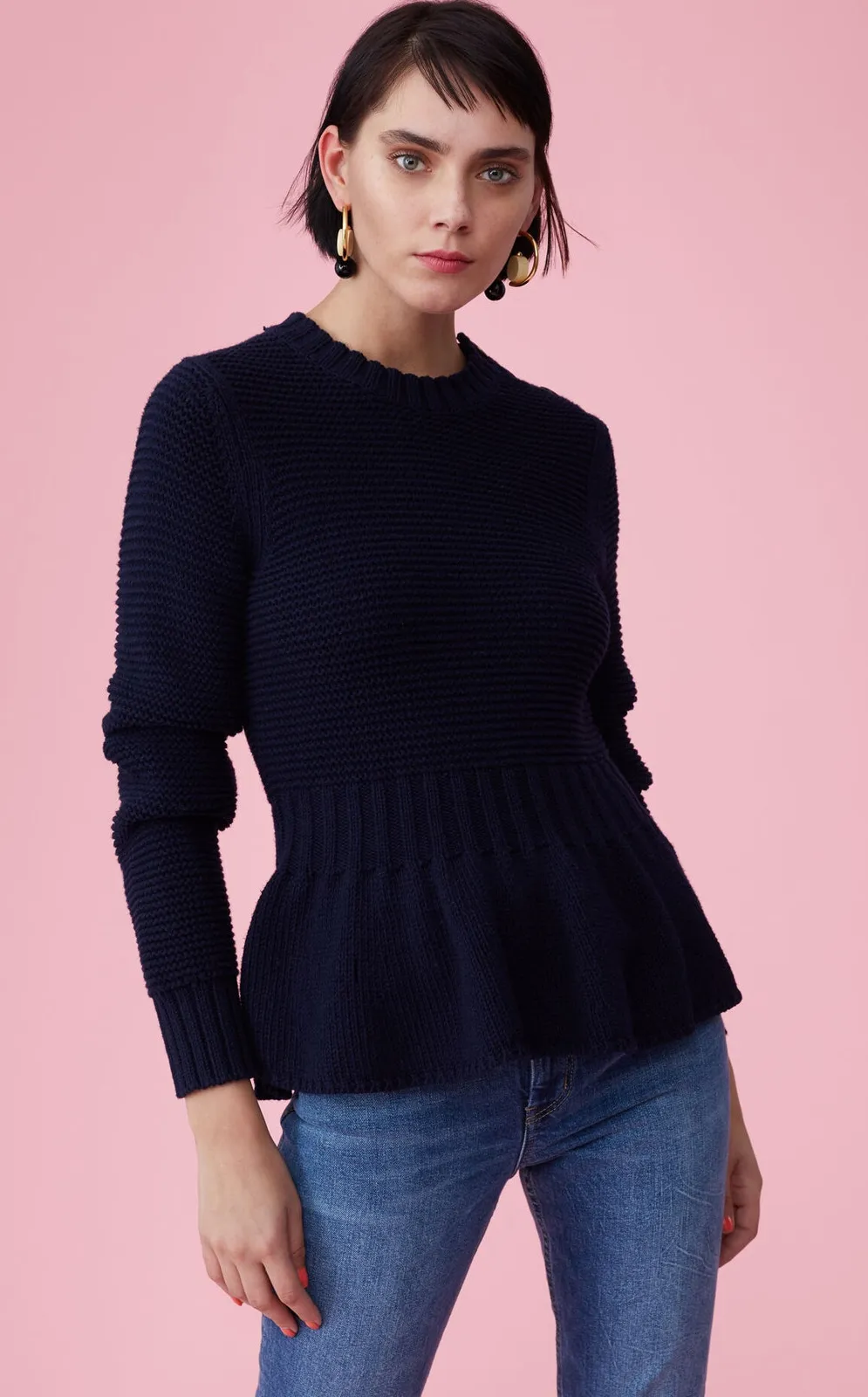 Navy blue wool blend peplum sweater. Slim long sleeves, peplum flares from the waist, exposed button... Show more