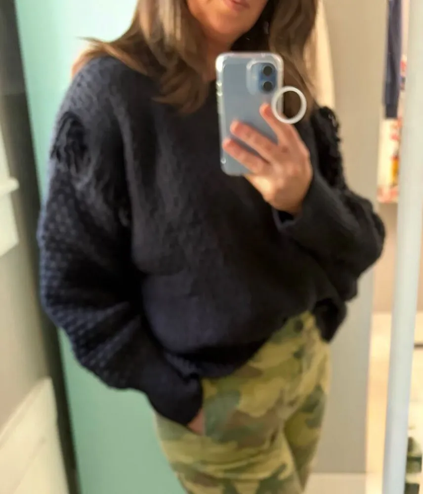 Treasure & Bond Mixed Stitch Balloon Sleeve Fringe Sweater Black Crew Size Small NWT. Long sleeves Balloon Sleeves. Textured knit. Dolman sleeves. Fringe trim. Tousled fringe on shoulders, cozy sweater. Crewneck. Ribbed cuffs and hem. 56% cotton, 19% acrylic, 18% polyester, 5% nylon, 2% spandex. Hand wash. This brand has Science-based climate action, validated by the Science Based Targets initiative to reduce greenhouse gas emissions. New with tags. Comfy Cozy Cabincore Embellished Prairie, boho, Bohemian, goth gothic clean fringe Trimmed Crewneck Sweater. Winter Fall Thanksgiving Christmas Gift NYE New Years Eve Valentines Gift Cottagecore, woodsy, rustic, romantic, soft, feminine, girly, shabby chic, rural, folklore, Preppy, Effortless, Sophisticated, Refined casual, Contemporary, Modern classics, Lagenlook, modest, nautical, practical, basic, solid, coastal grandma, minimal, simple, modern, classy, classic, timeless, neutral, Career, office, work, careerwear, Classic, Retro,