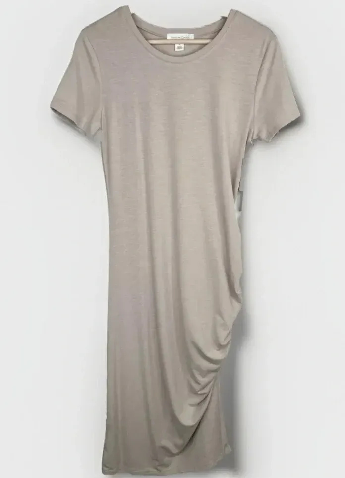 With its short sleeves and flattering midi length, this dress is a versatile addition to any wardrobe. Available in size M, New with tags Brand: Treasure & Bond Size: M Style: T-Shirt, Midi Dress Dress length: Midi Color: Beige Oatmeal Medium Heather Department: Women Sleeve length: Short Sleeve Material: Polyester, Rayon, Spandex Features: Ruched side detail, Stretchy and comfortable fabric Country/region of manufacture: Vietnam Measurements approximately: Sleeve length 7.25” Underarm to underarm 16.75” Total length 43” ⭐️Smoke Free Environment