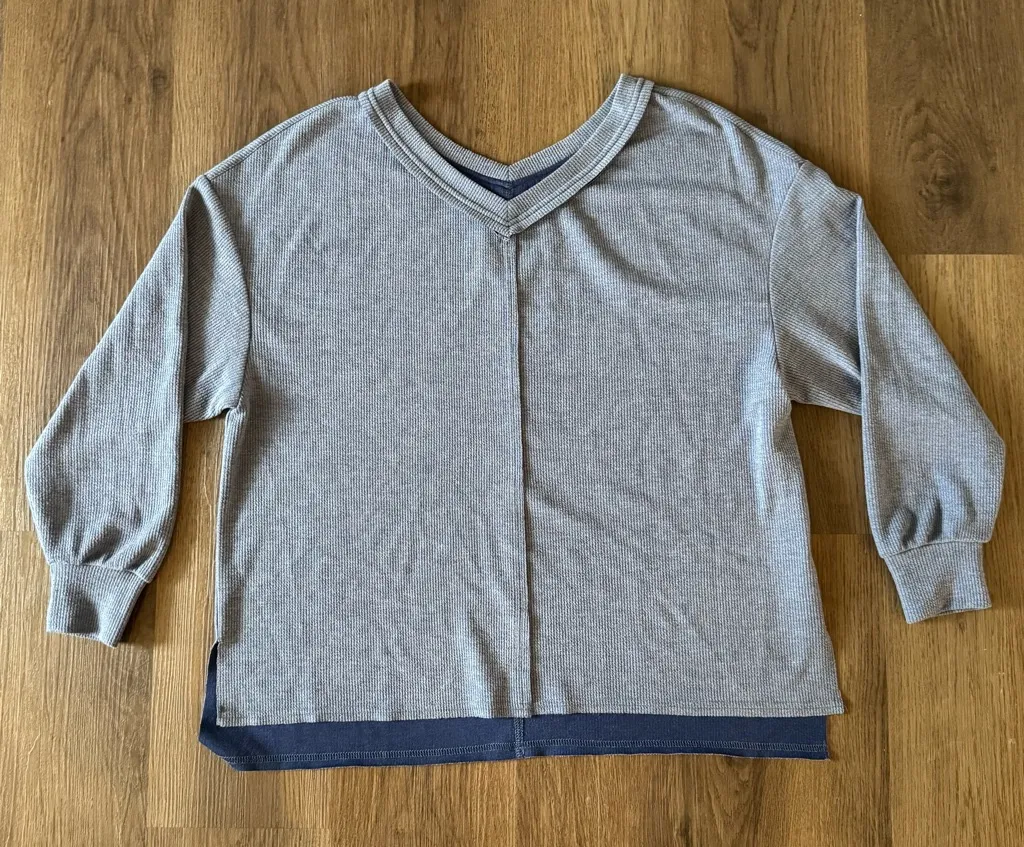 A Tredy Queen women's blue v-neck long sleeve top. This shirt features a waffle knit texture on the outer layer and a solid navy blue inner layer creating a subtle, stylish contrast. The neckline has a unique layered v-neck design, and the sleeves are full length with a gathered cuff detail. The hem is slightly longer in the back and features side slits for a relaxed silhouette. Perfect for casual outings, errands, or lounging at home. Type: T-Shirt Department: Women Style: Basic Neckline: V-Neck Sleeve Length: 3/4 Sleeve Sleeve Type: Balloon Sleeve Pattern: Solid Features: Stretch Fit: Relaxed Keywords: Tredy Queen, waffle knit, layered look, v-neck, long sleeve, pullover, casual, loungewear, basic, everyday, fall fashion, spring style, comfortable