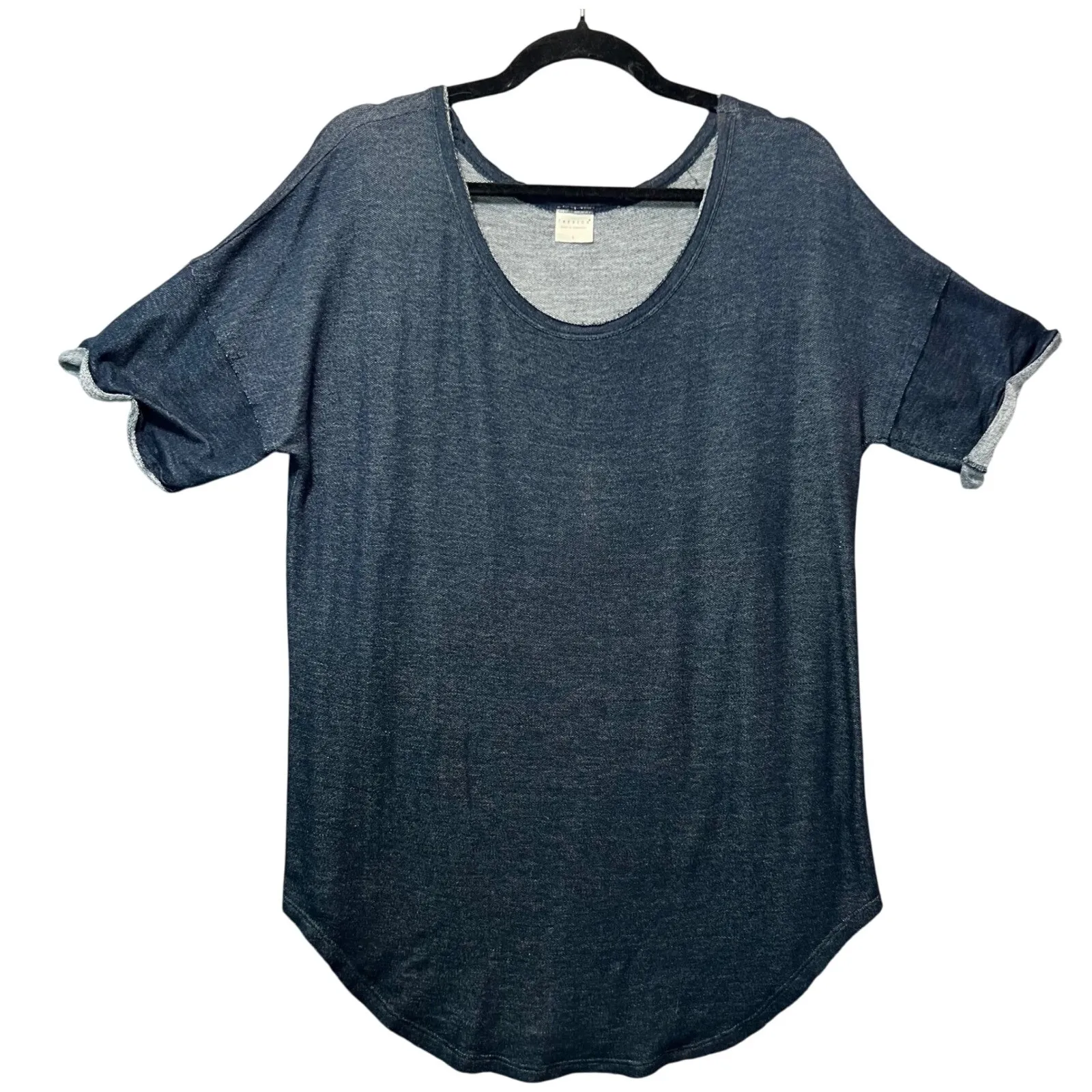 Casual raw hem top for everyday wear. This garment features a scoop neck design and short sleeves with folded cuffs, offering a relaxed fit that's both stylish and comfortable. The top's overall design is enhanced by a unique fading pattern, adding a touch of individuality to its appearance. A rounded hemline and lightweight material make this top suitable for various occasions, whether layered or worn on its own. Color: Blue Type: T-Shirt Department: Women Style: Basic Material: Rayon, Polyester, Spandex Neckline: Scoop Neck Sleeve Length: Short Sleeve Sleeve Type: Casual Sleeve Pattern: Solid Features: Raw Hem, Lightweight, Comfortable Fit, Rounded Hem, Breathable Fit: Relaxed Keywords: Tresics, Blue top, Short sleeve top, Scoop neck top, Casual top, Raw hem top, Womens top, Comfortable top, Everyday top, Relaxed fit, T-shirt, Summer top, Lightweight top, Rounded hem