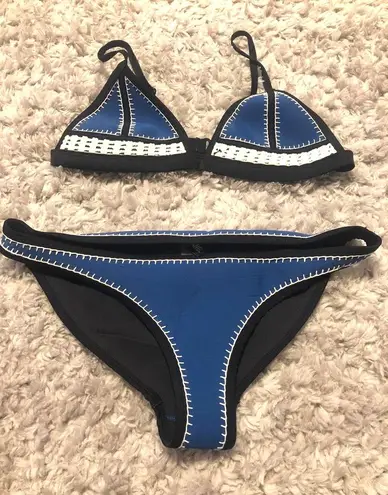 Navy bikini with crochet white detailing. Original clasp on the top broke, so I had a new clasp adde... Show more