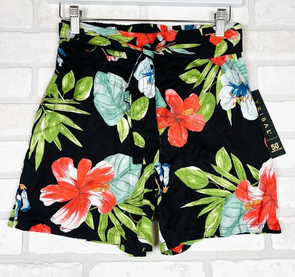 Tribal Floral Bright Shorts with front tie, NWT, $78 retail, Size XS w/stretch . Dive into summer with these vibrant tropical floral swim shorts. Featuring a bold black background with red and green accents, these shorts are perfect for making a splash. Back waist has stretch to it and front is flat for a very flattering fit! Great for over a swimsuit or pair with a tank top in the sunshine! Travel, Cruise, Summer, Beach. 13” waist, 11” rise, 4.5” inseam. #874 4.7