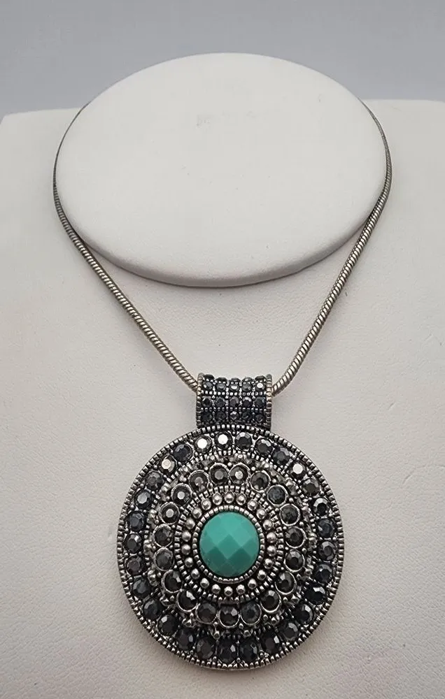 Trifari silver tone snake chain necklace with a silver tone medallion pendant with a blue rhinestone in the center and gunmetal rhinestones in two surrounding layers. Has a silver tone lobster claw closure. Necklace length: 16" with a 2" extender Pendant drop: 2" Hangtag maked: TRIFARI Most jewelry items are not tested, unless it is specified in the listing that it has been tested, all other items are described only by the stamps and markings, which I am happy to show pictures of.