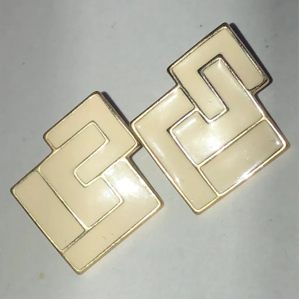 Stylish geometric earrings in cream and gold tone. Perfect for any occasion. Good condition. Trifari Approximately 1.25” x 1.5” F2 Boho Vintage Street Style Minimalist Statement Piece Essential Trendy Fashion Forward Must-Have On-Trend Cute Casual Edgy Classic Rare Find retro mid century modern estate jewelry costume jewelry