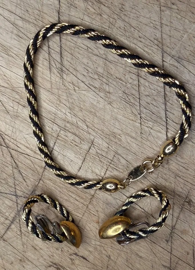 This Trifari set features a sophisticated gold and black twisted rope design, offering timeless eleg... Show more