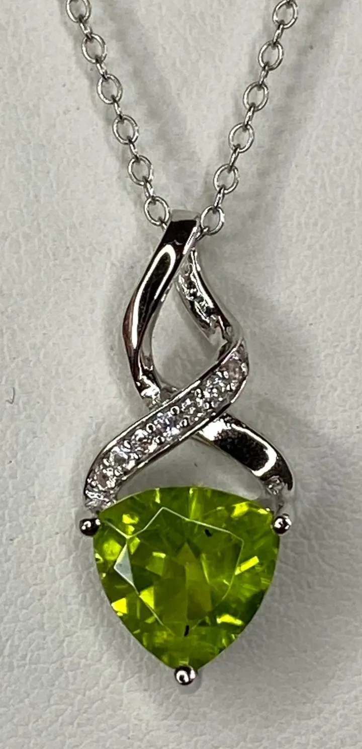 Product Information 2.50ctw trillion Manchurian Peridot with .01ctw round white zircon rhodium over sterling silver pendant with chain. Measures approximately 7/8"L x 7/16"W. 2mm bail. Spring ring clasp. Dimensions 0.88in L x 0.44in W Metal Weight 1.95 g Bail Opening 2.0mm Pendant: 3/4 inch Chain: 18 inches Primary Stone Gemstone Manchurian Peridot Gemstone Species Olivine Brand Manchurian Peridot Carat Weight 2.5 ctw Gemstone Shape Trillion Gemstone Dimensions 9.00mm L x 9.00mm W Cut Faceted Gemstone Composition Natural Enhancement No Treatment Material Composition Natural Origin Country China Accent Stone Gemstone Zircon Carat Weight 0.01 ctw Gemstone Shape Round