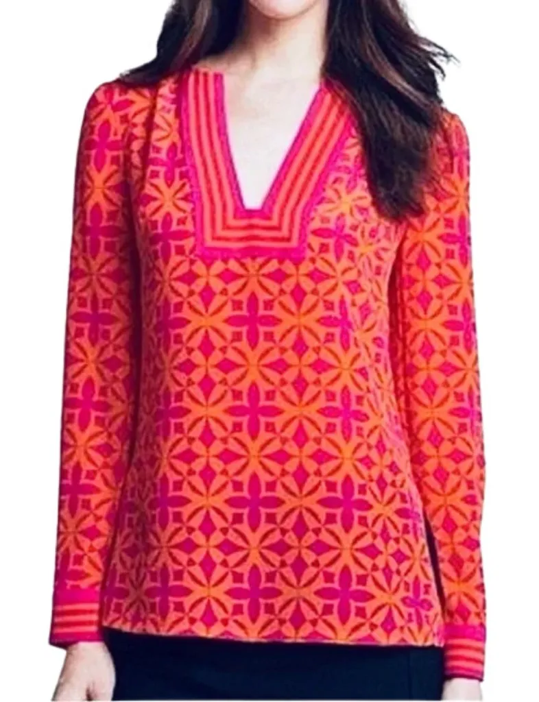 The Trina Turk 100% Silk Printed Blouse Top in Women's Small is a vibrant and stylish addition to an... Show more