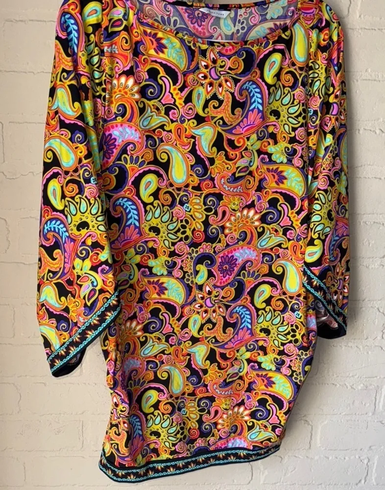 Bright and colorful paisley tunic top. Features a mix of vibrant colors and a flowing design. Trina... Show more