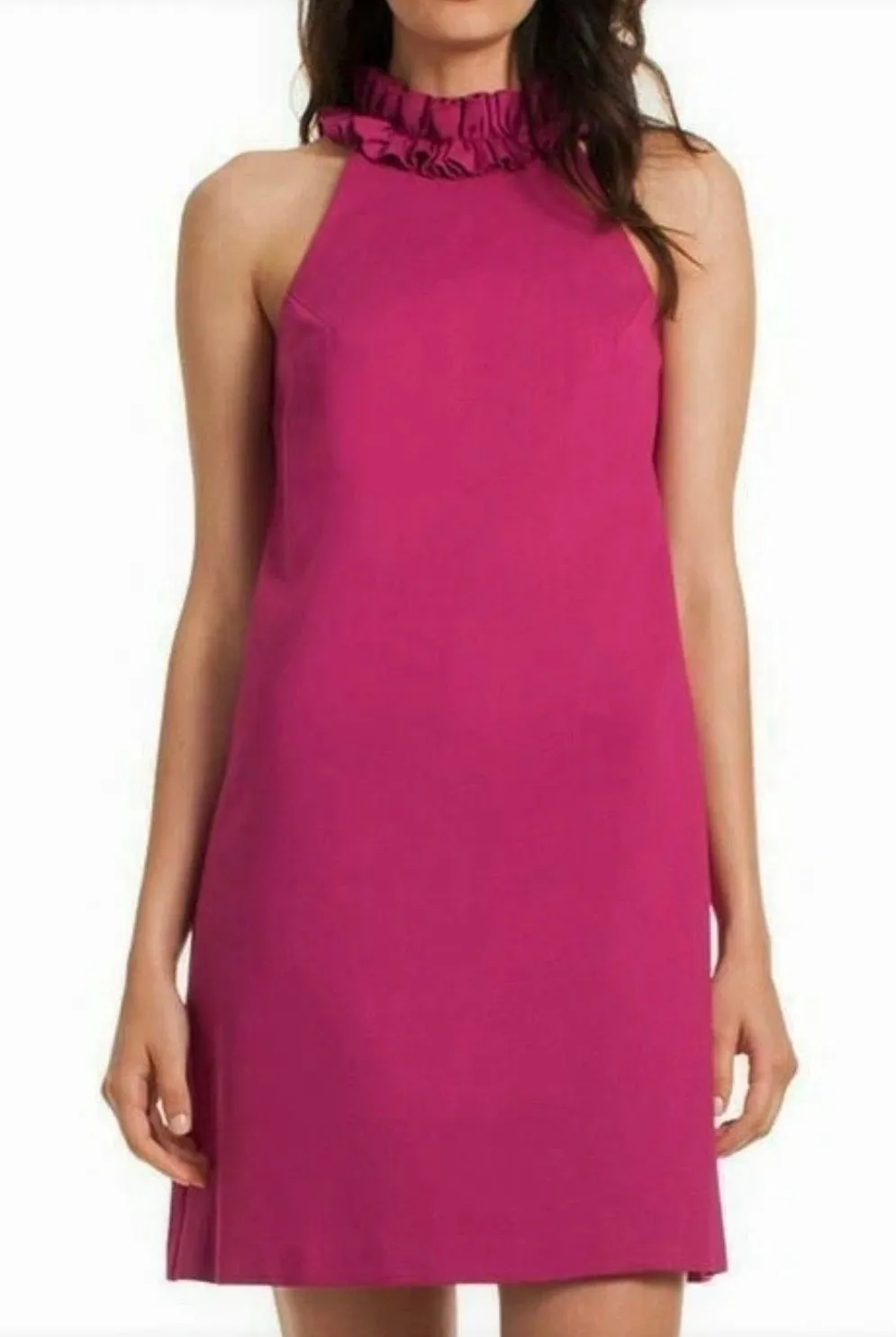 Keywords: Trina Turk, shift dress, magenta, pink dress, halter dress, ruffle collar, sleeveless, cocktail dress, party dress, summer dress, wedding guest, brunch outfit, designer dress, bold color, shift dress, designer, preppy, 60s style, mod, barbiecore, chic