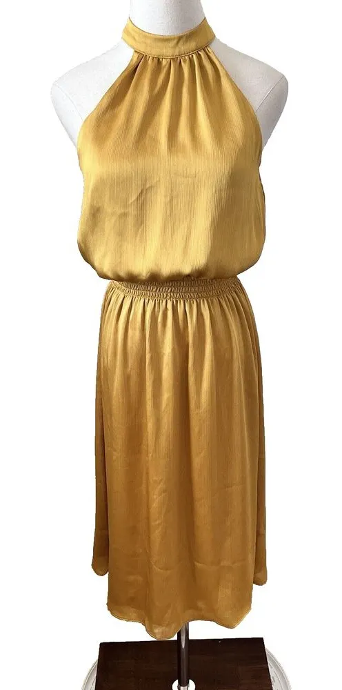 Trina Turk Moonlit‎ Dress Gold Ray halter style Midi Dress Sz XS Stretch Waist - $70 - From Prema