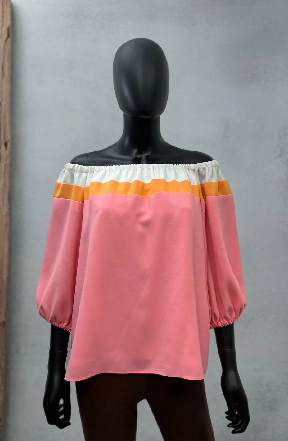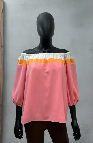 Make a bold and playful statement with this Trina Turk off-the-shoulder puff sleeve blouse in vibran... Show more