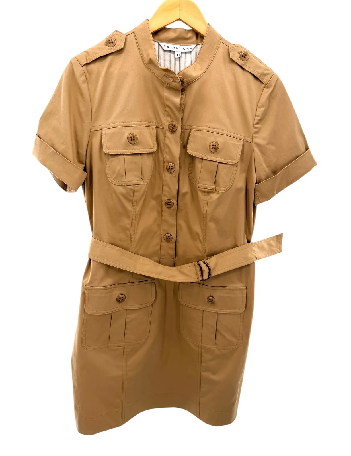 Trina Turk safari-inspired utility shirt dress in a classic tan khaki hue. This polished yet effortl... Show more