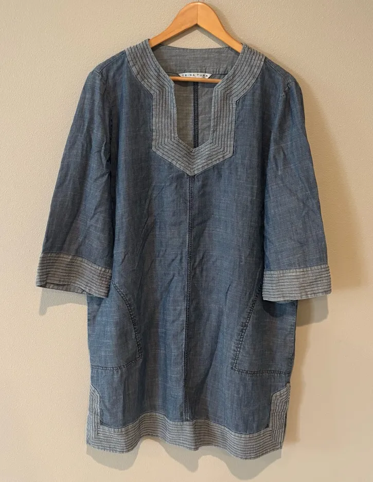 Trina Turk Los Angeles Carnelian Chambray Mini Dress 3/4 sleeves Linen blend V neck Split hem... Show more