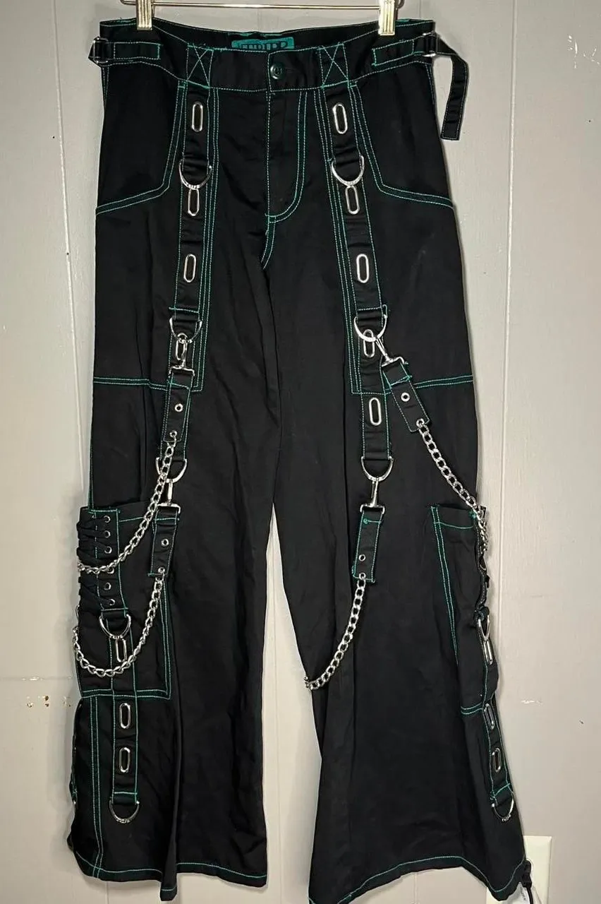 Tripp NYC Black and Green Cargo Pants Baggy with Chains Size 3 . . Measurements Waist: 30in Inseam: 31.5in Rise: 9 in Foot Holes: 14in flat across . . Very good used condition. . . #punk #grunge #gothic #scene black and green, cargo joggers, chain detail, distressed, grunge aesthetic, goth style, edgy streetwear, oversized, alternative fashion, urban