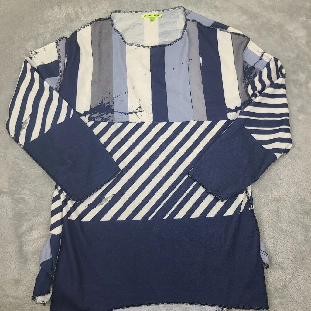 Elevate your casual wardrobe with this beautiful Art to Wear blouse by Trisha Tyler. The abstract blue and white floral pattern adds a touch of boho chic to any outfit. The long sleeves and lightweight fabric make it perfect for cooler weather, while the pullover closure ensures a comfortable fit. This blouse is a must-have for any fashion-forward woman. The petite medium size fits true to size, and the regular fit is flattering on any body type. Whether you're dressing it up or down, this blouse is sure to make a statement. Add it to your wardrobe today! Trisha Tyler Abstract Blue White Art to Wear Casual Boho Blouse Petite Medium