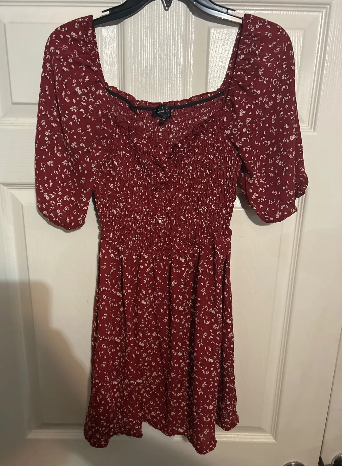 Rustic charm unfolds in this TRIX Clothing Co. dress, a vibrant symphony of feminine flair and free-spirited elegance. A sweetheart neckline and playful puff sleeves whisper romance, while the smocked bodice gracefully accentuates the figure, offering both comfort and a flattering silhouette. Tiny white floral embellishments dance across the rich red fabric, creating a look that's both eye-catching and effortlessly chic. Style: Mini, A-Line, Sundress, Fit & Flare Dress Length: Short Color: Red Department: Women Sleeve Length: Short Sleeve Pattern: Floral Occasion: Casual, Party/Cocktail, Travel Material: Polyester Neckline: Sweetheart Character: Boho, Romantic, Picnic, Summer, Casual Fabric Type: Woven Season: Spring, Summer Keywords: TRIX Clothing Co., red floral dress, smocked dress, sweetheart neckline, puff sleeves, mini dress, womens dress, casual dress, summer dress, bohemian dress, party dress, floral print, size medium, M