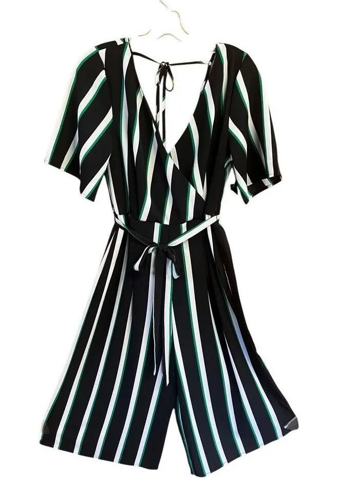 TRIXXI Striped Jump Suit Lightweight Low V Wrap neckline Wide-leg Sz XL Black Green and white L... Show more