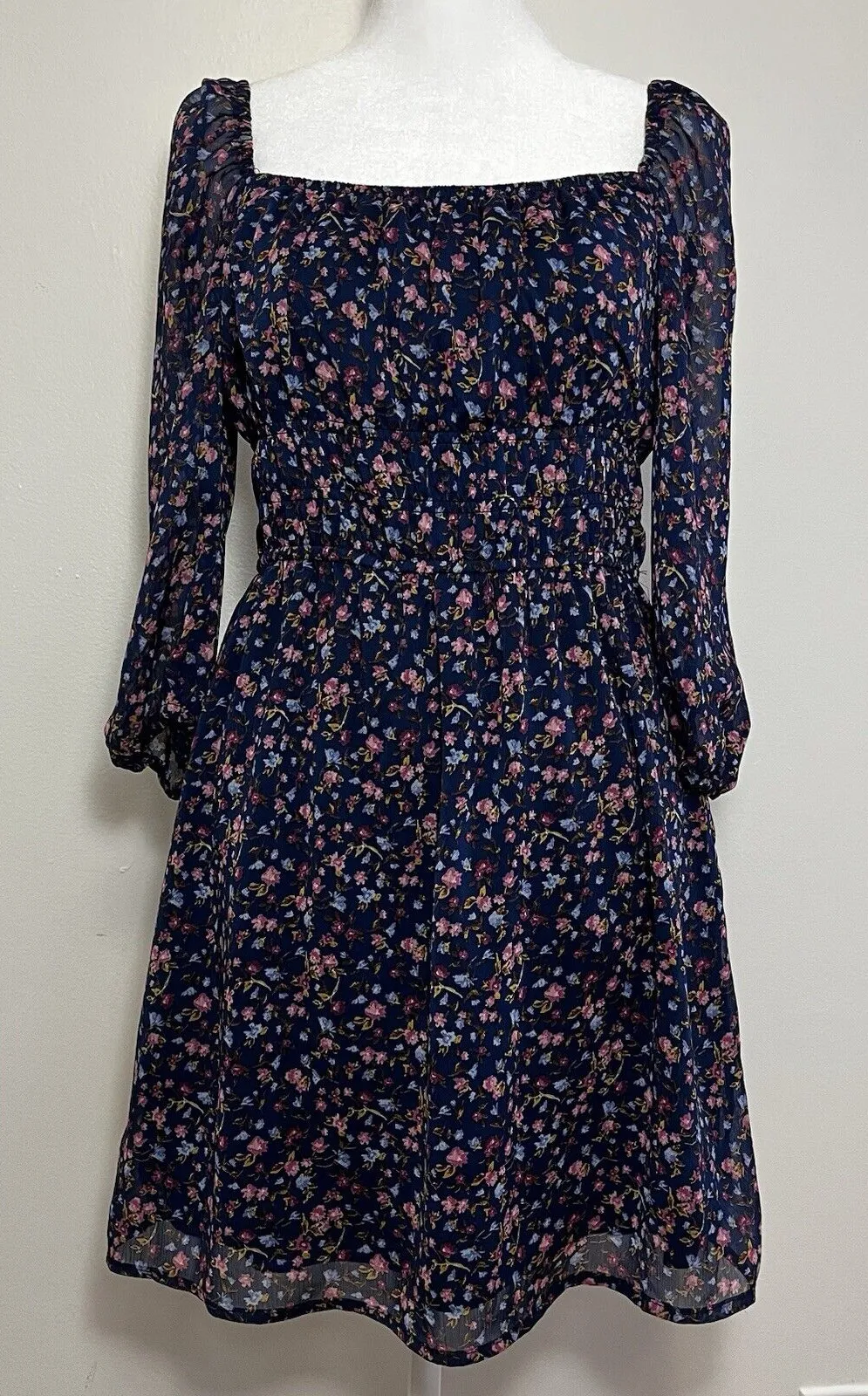 Trixxi Women’s Floral Mini Dress Size M Navy Elastic Waist Lined Long 3/4 Sleeve Sheer sleeves but b... Show more