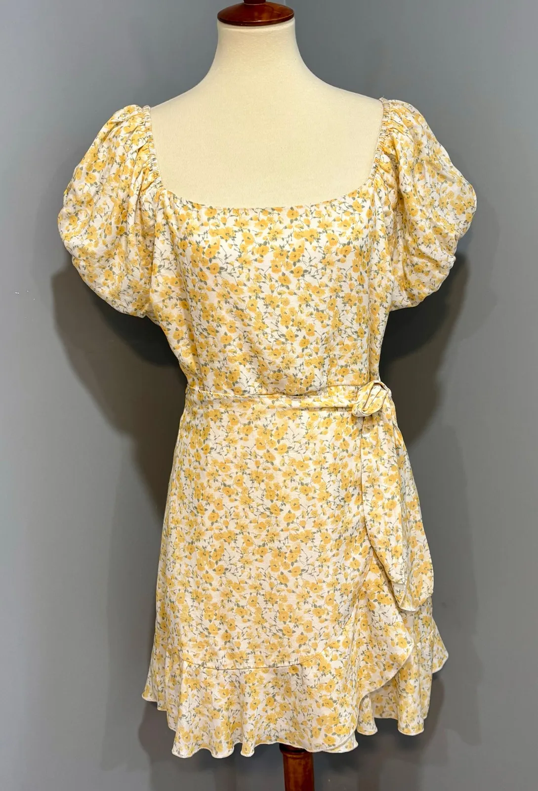 Yellow and white floral cottagecore, puff-sleeve wrap-dress mini, Ruffle bottom, size XL Puff sleev... Show more