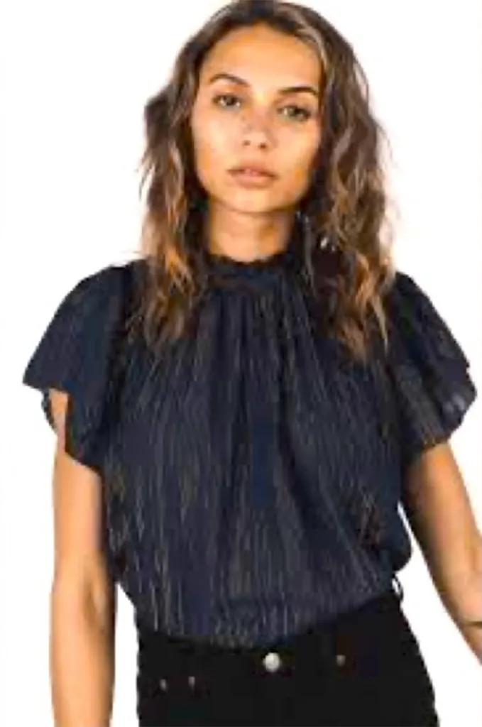 Trovata Birds of Paradise Carla High Neck Too, size XS. This beautiful navy pleated top features gold metallic accent treads. The high neck has a back closure button. Extra button still attached to the care tag. This is in excellent condition with no flaws. Measurements taken flat.