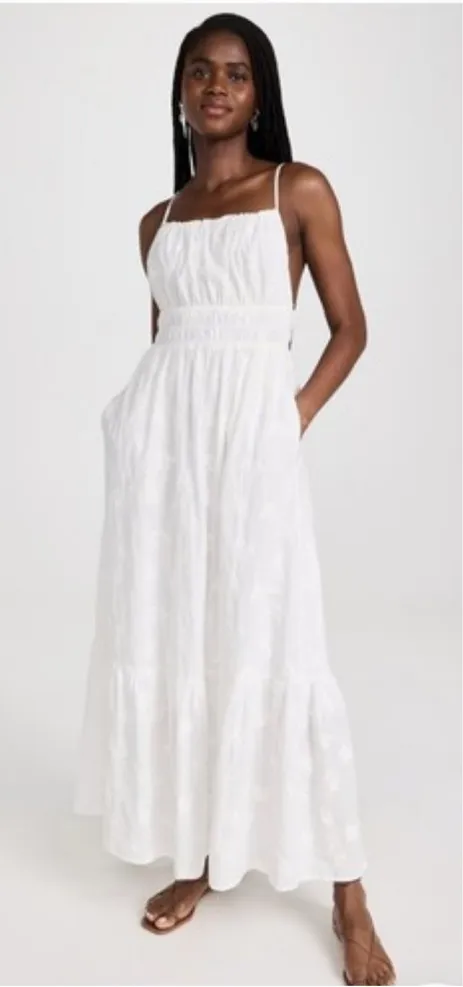 Trovata Birds of Paradise Mirabella Maxi Dress in White Floral Eyelet, Size Small. This is brand new with the tags still attached, and has no flaws. This dress features a beautiful white floral eyelet pattern throughout, with adjustable straps, and elastic waistband, and pockets! 100% cotton and it is lined. Measurements taken flat. Waist will stretch to 15” Length 60”