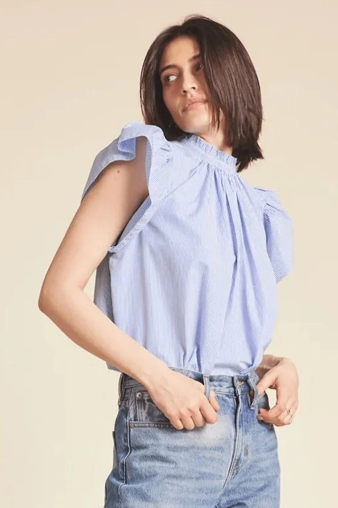 High neck with ruffle collar Wide ruffle/flutter sleeves A-line body Single button at back of neck Trim details along the hemlines 100% Cotton Size: Small Bust: 26.5” Length: 20”-22” (longer in the back) Color: Blue and white stripes Condition: Pre-loved. Excellent condition with no stains or flaws.