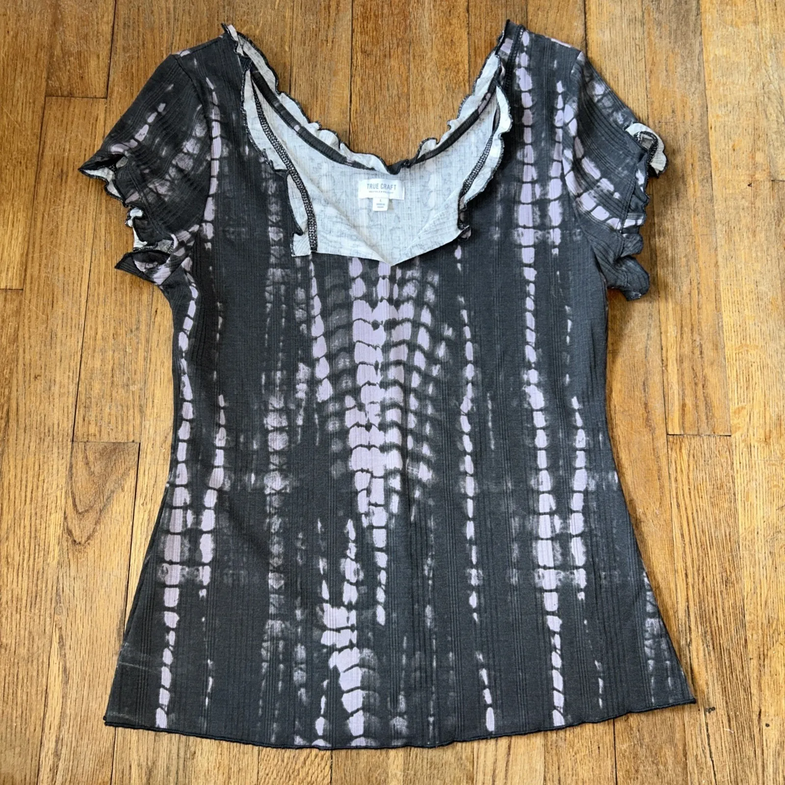 This Tie Dye Short Sleeve V Neck with Ruffle Edges Fairy Grunge L Fitted Top Shirt by True Craft is... Show more