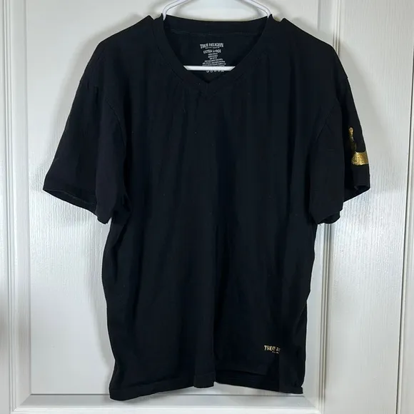 True Religion Black Gold Logo Short Sleeve V-Neck Shirt Size XL EUC #2731 - $23 - From Vir