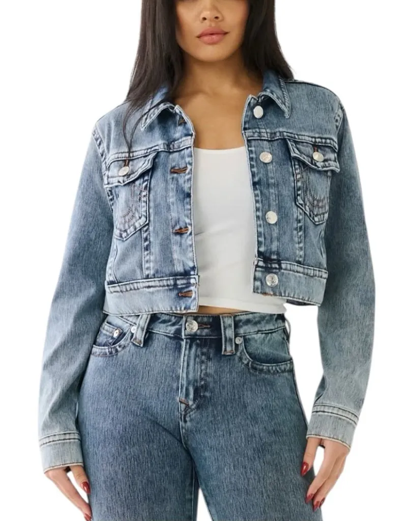 True Religion cropped denim jacket featuring the iconic Jimmy Crop silhouette and classic contrast s... Show more